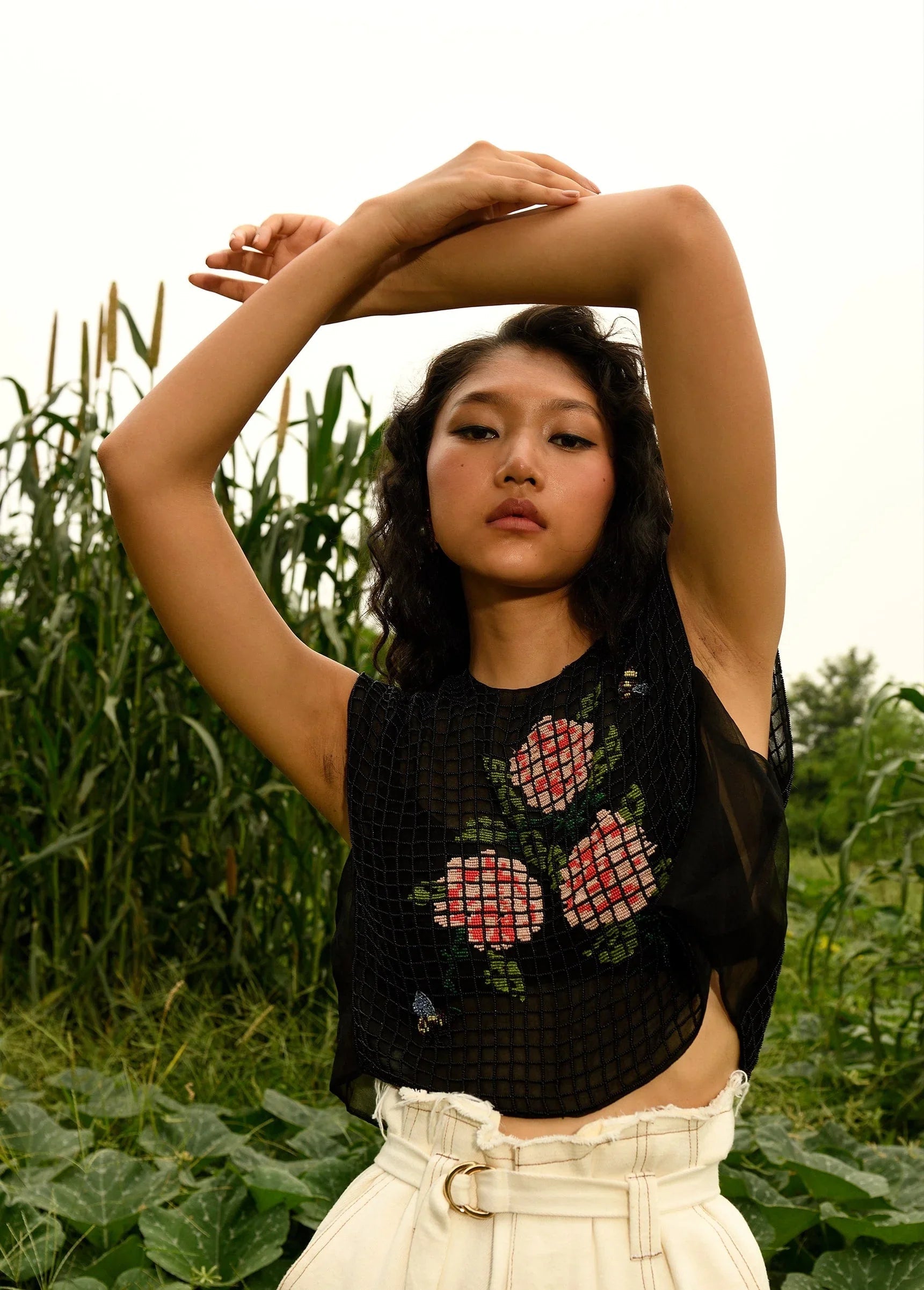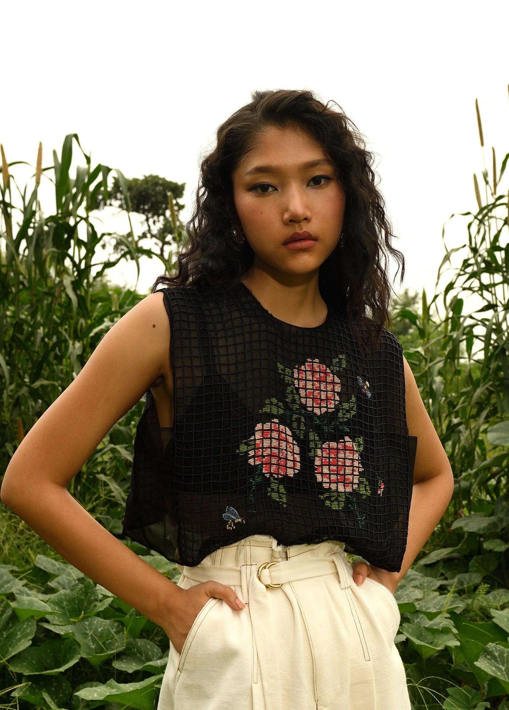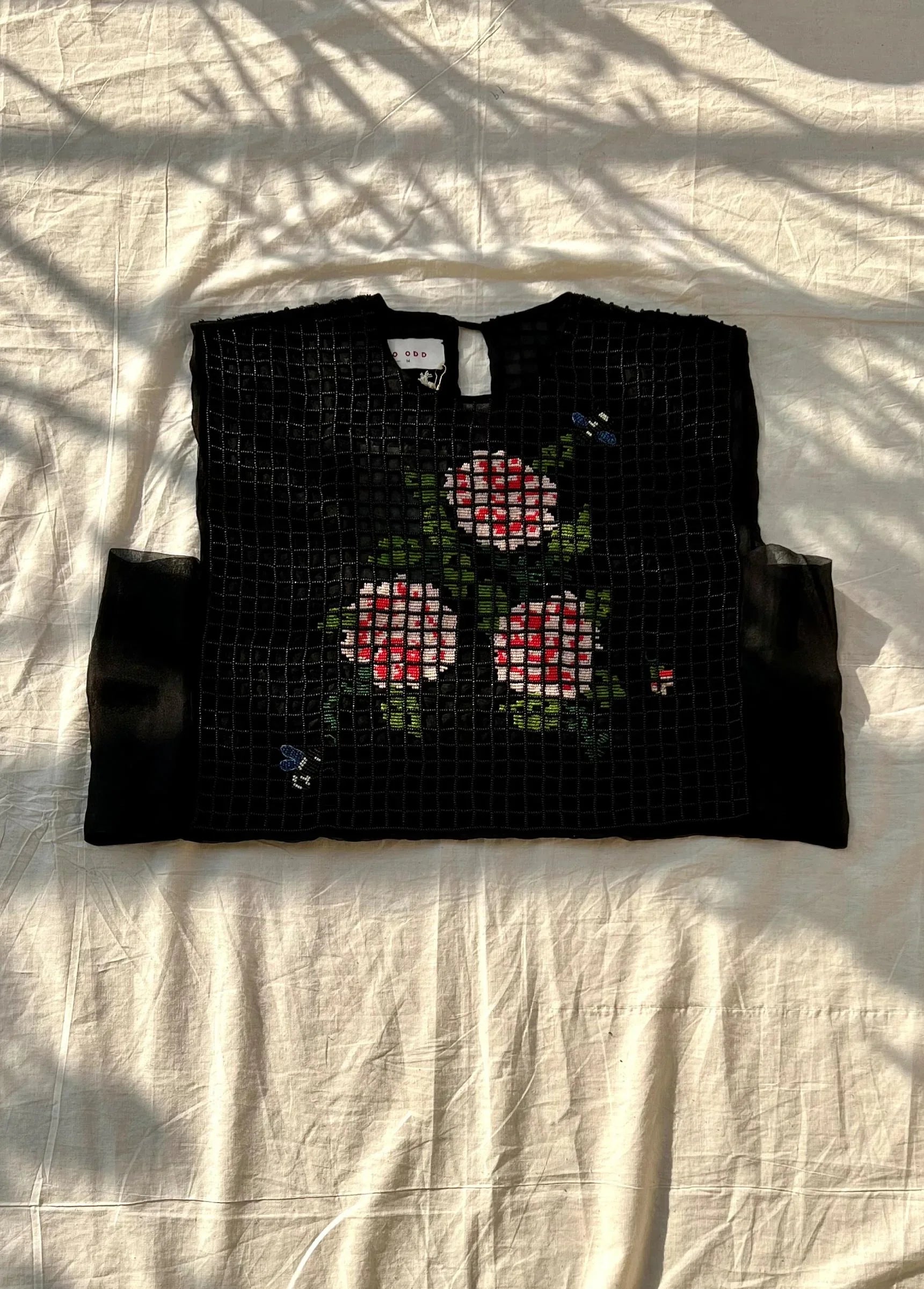 Hand-embroidered bib made in 100% silk organza reinterpreting the age-old cross-stitch technique with a back button closure.