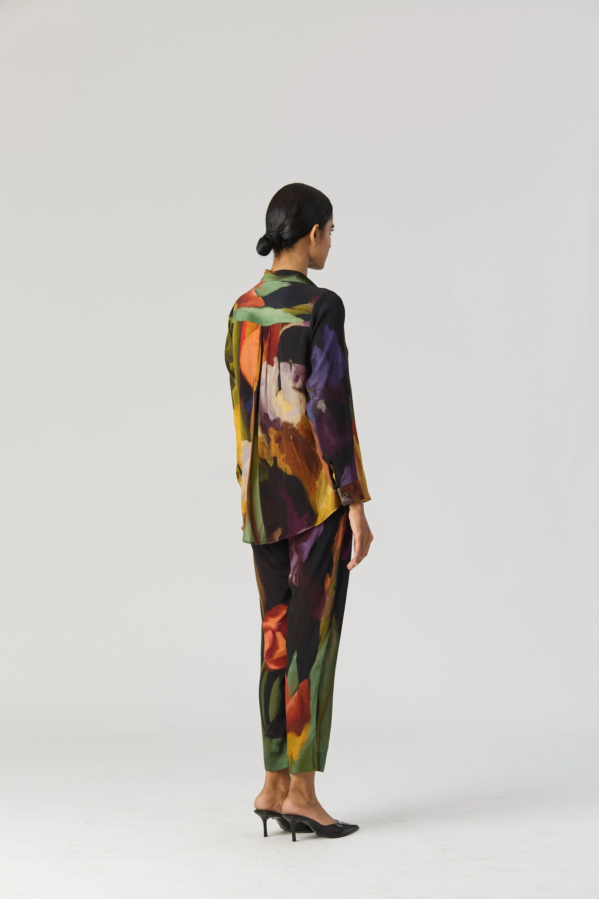 The shirt is designed with attention to detail, featuring a button-down front, collar, and cuffs. The straight-fit pants come with side pockets for added convenience and back elastication for a comfortable fit. This ensemble effortlessly combines style and comfort for versatile wear.