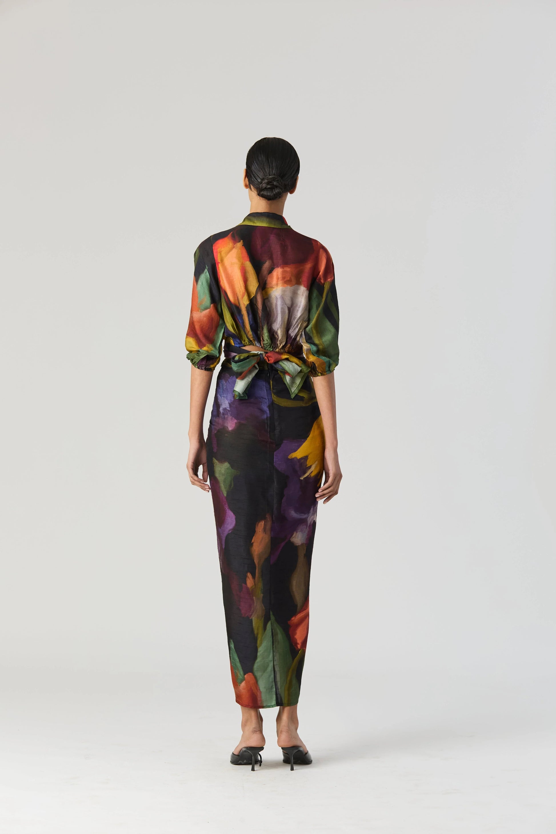 The set includes front knotted skirt and a Tie up top crafted in Dora silk fabric.