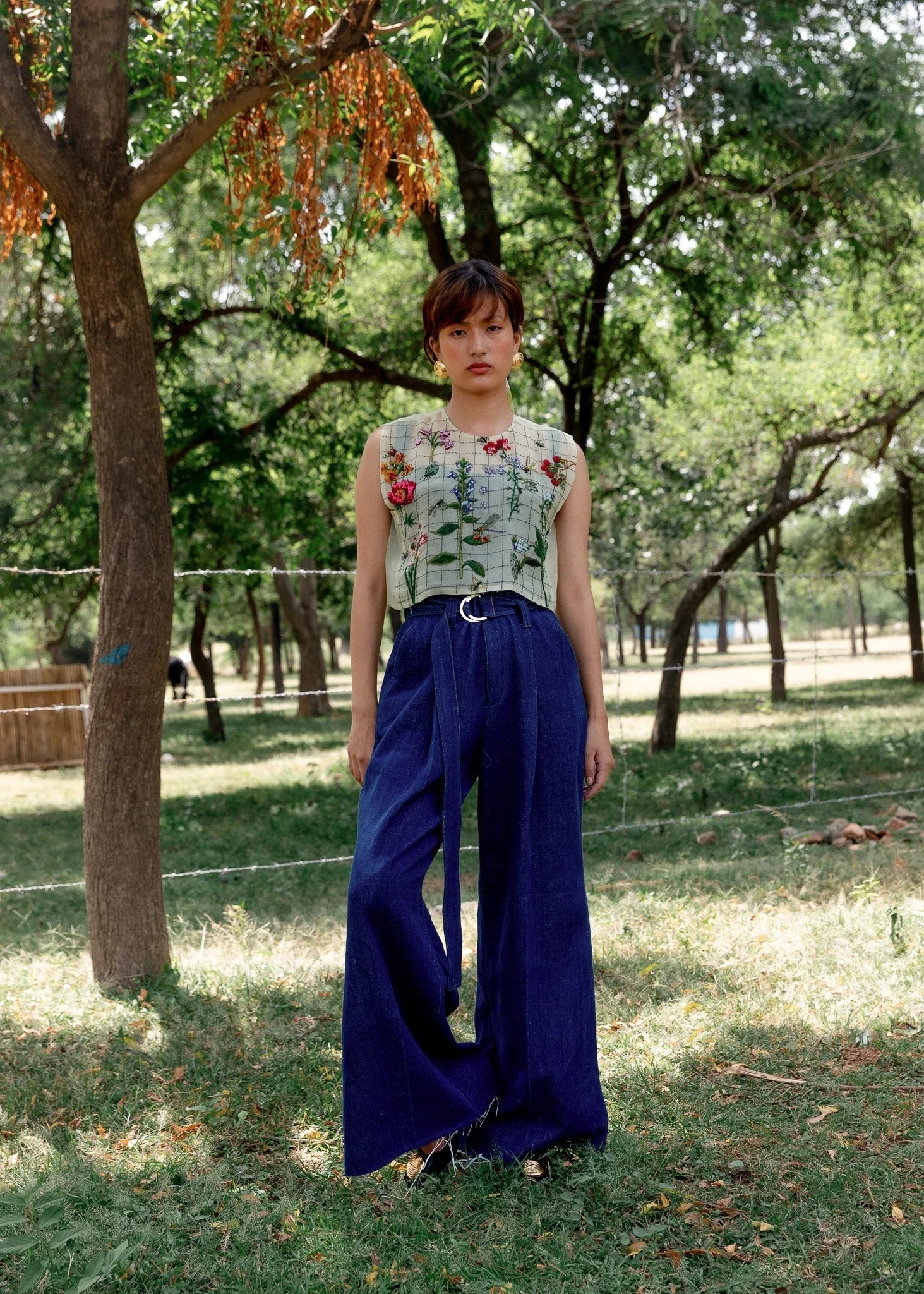 Floral bib made in 100% silk organza with beaded embroidery details on digitally printed fabric. It is made reinterpreting the age-old cross-stitch technique featuring a side panels.
