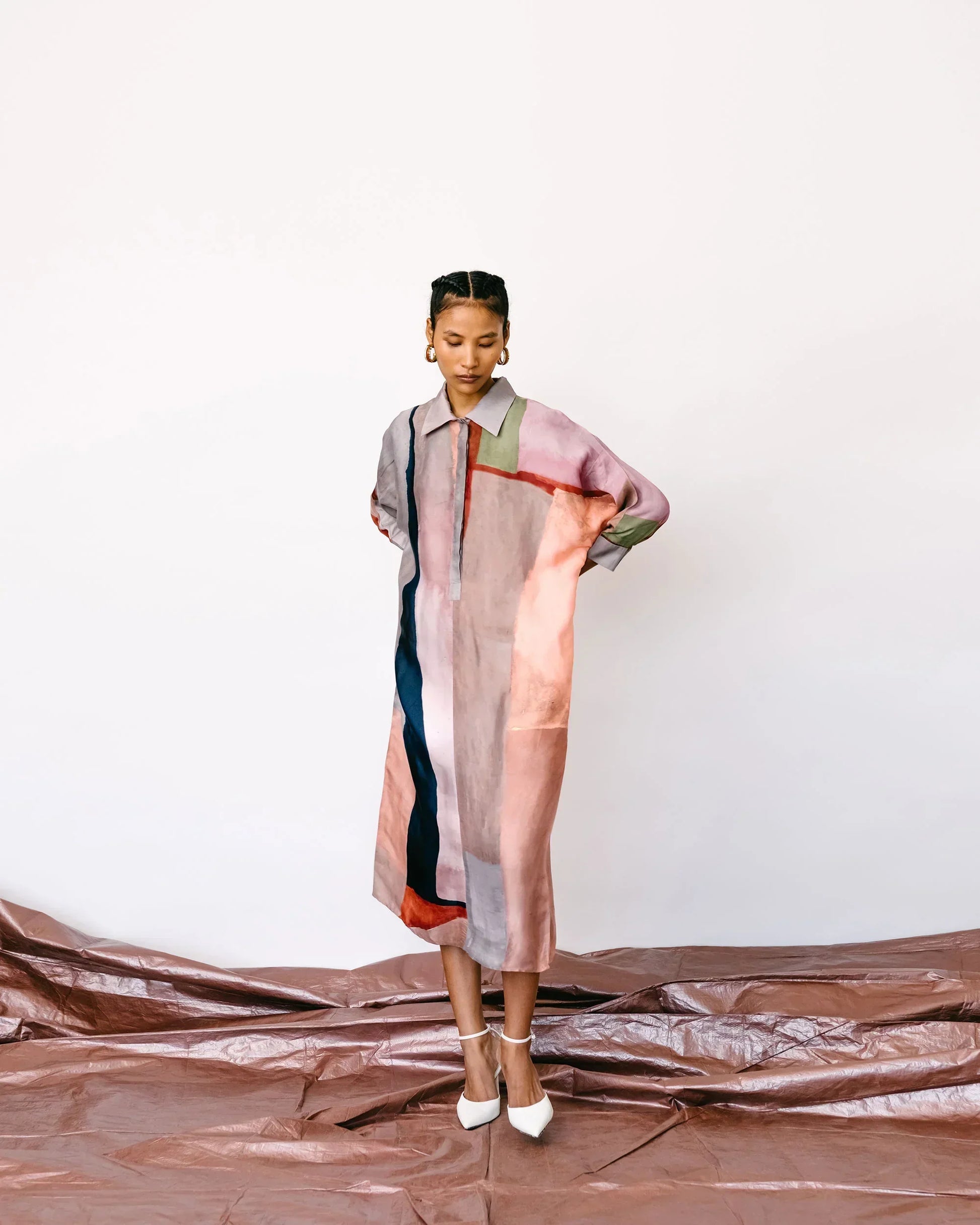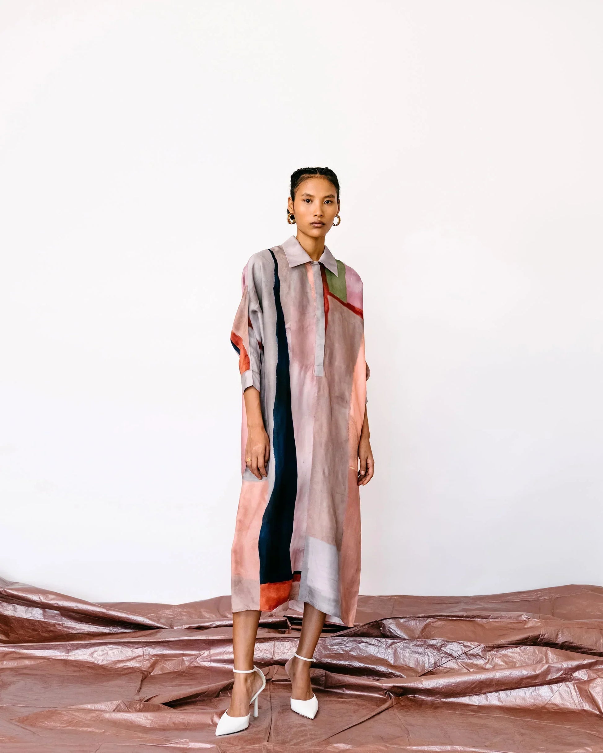 This elegant shirt dress features an anti-fit silhouette with delicate pleated detailing at the back, complemented by a refined collared placket. Intricate insert embroidery adds a subtle touch of artistry, all crafted from luxurious matte finish satin. Designed for effortless sophistication, it requires minimal dry cleaning, encouraging more wear and lasting beauty.