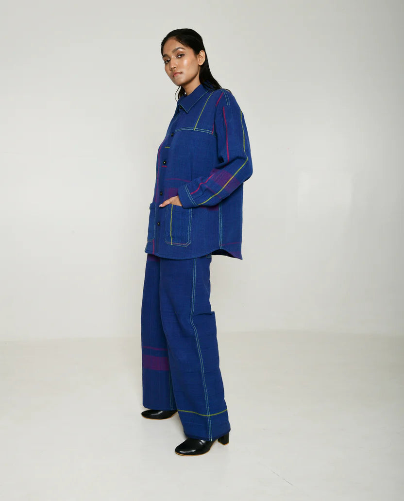 Handwoven unisex jackets are skillfully crafted using our recycled fabric with the extra weft technique on frame looms. Each jacket is made from manufacturing waste collected over the past year, undergoing meticulous re-weaving and re-imagining for a fresh and unique appearance. This sustainable and eco-friendly fashion choice is created entirely from 100% cotton.